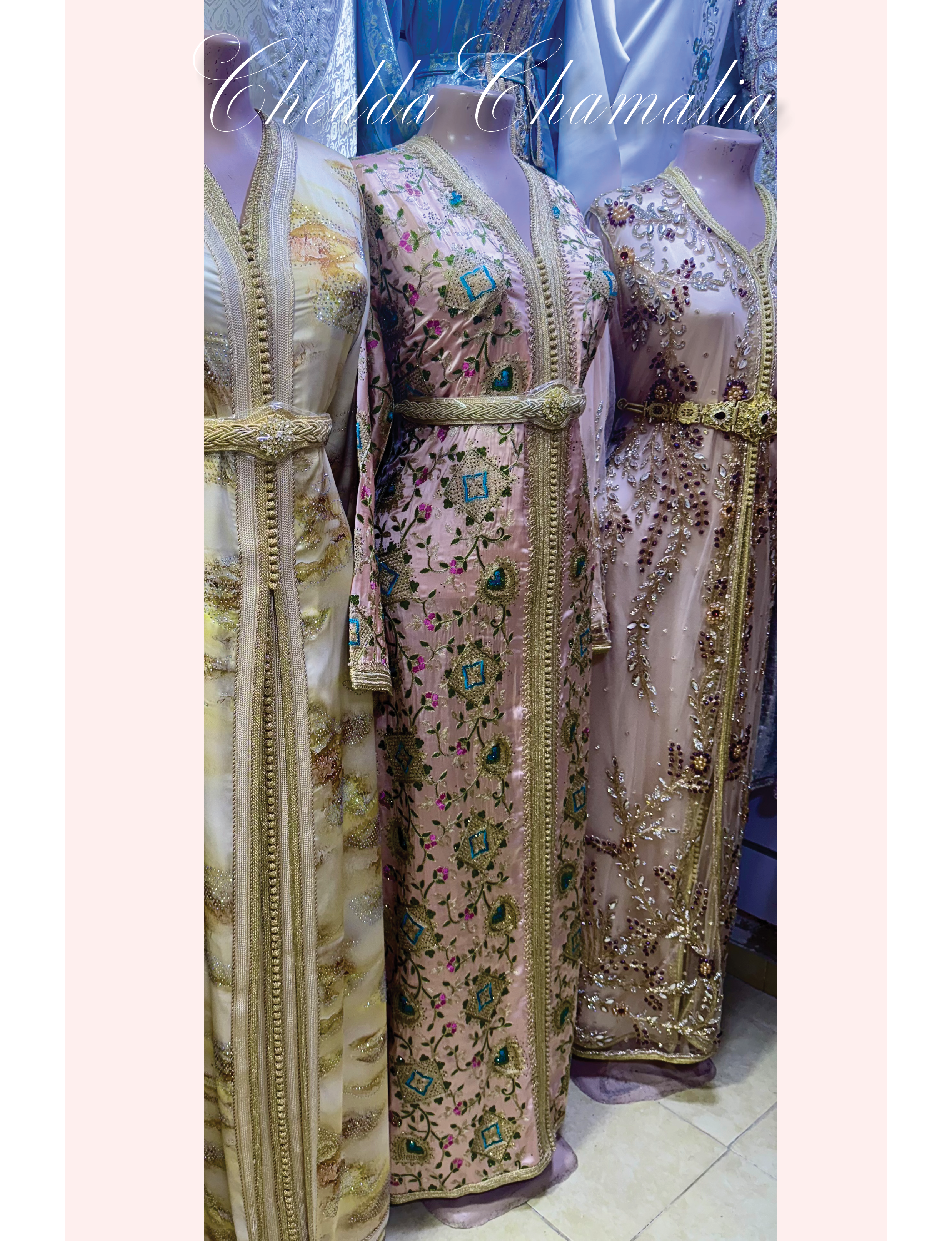 The Chedda Chamalia are opulent, and ornate traditional bridal outfits from the Northern Moroccan regions of Chefchaouen, Tangier, and Tetouan. Overlays of fabrics featuring “El Bhaja” embroidery are often worn with heavy gold jewelry.