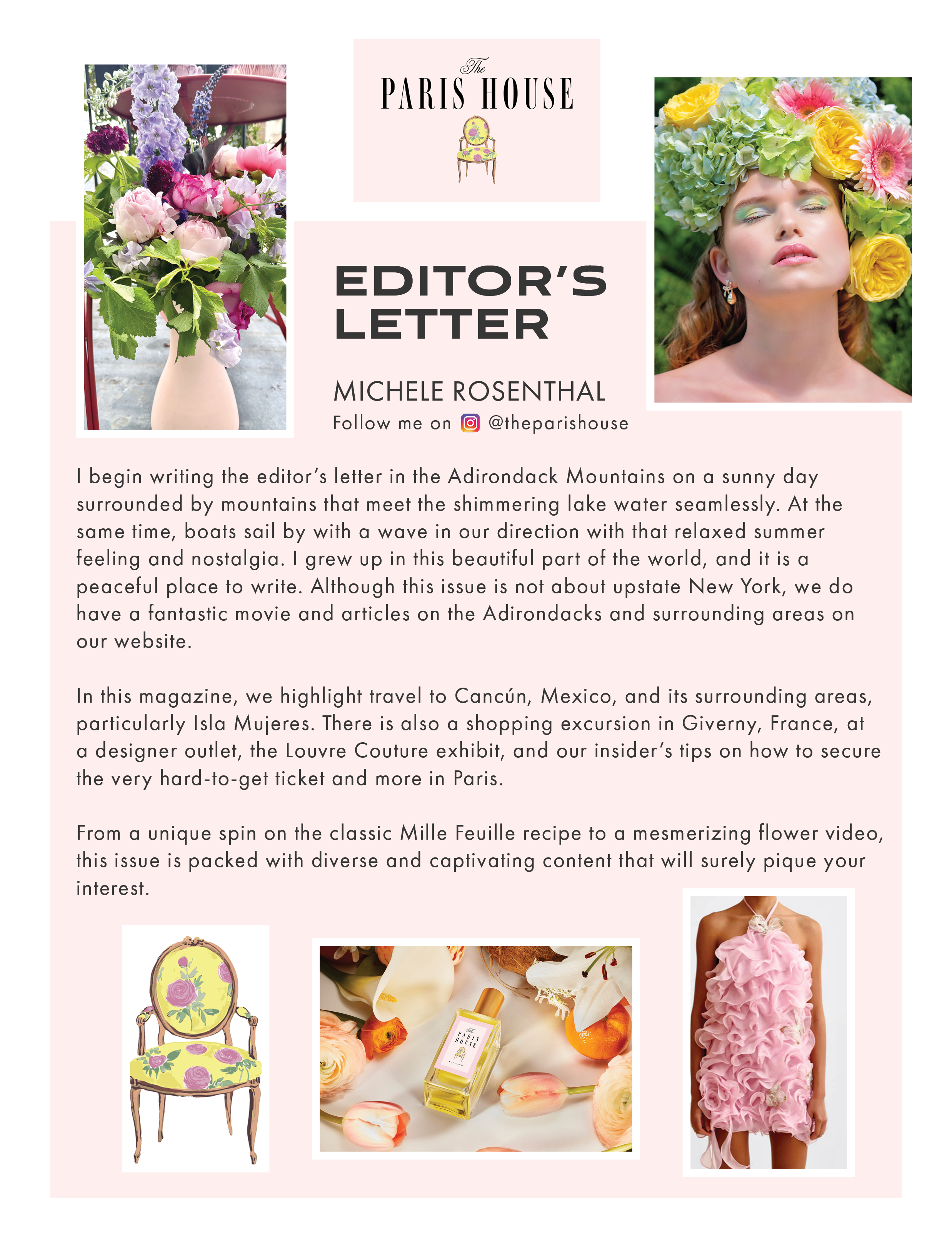 In this magazine, we highlight travel to Cancún, Mexico, and its surrounding areas, particularly Isla Mujeres. There is also a shopping excursion in Giverny, France, at a designer outlet, the Louvre Couture exhibit, and our insider's tips on how to secure the very hard-to-get ticket and more in Paris.