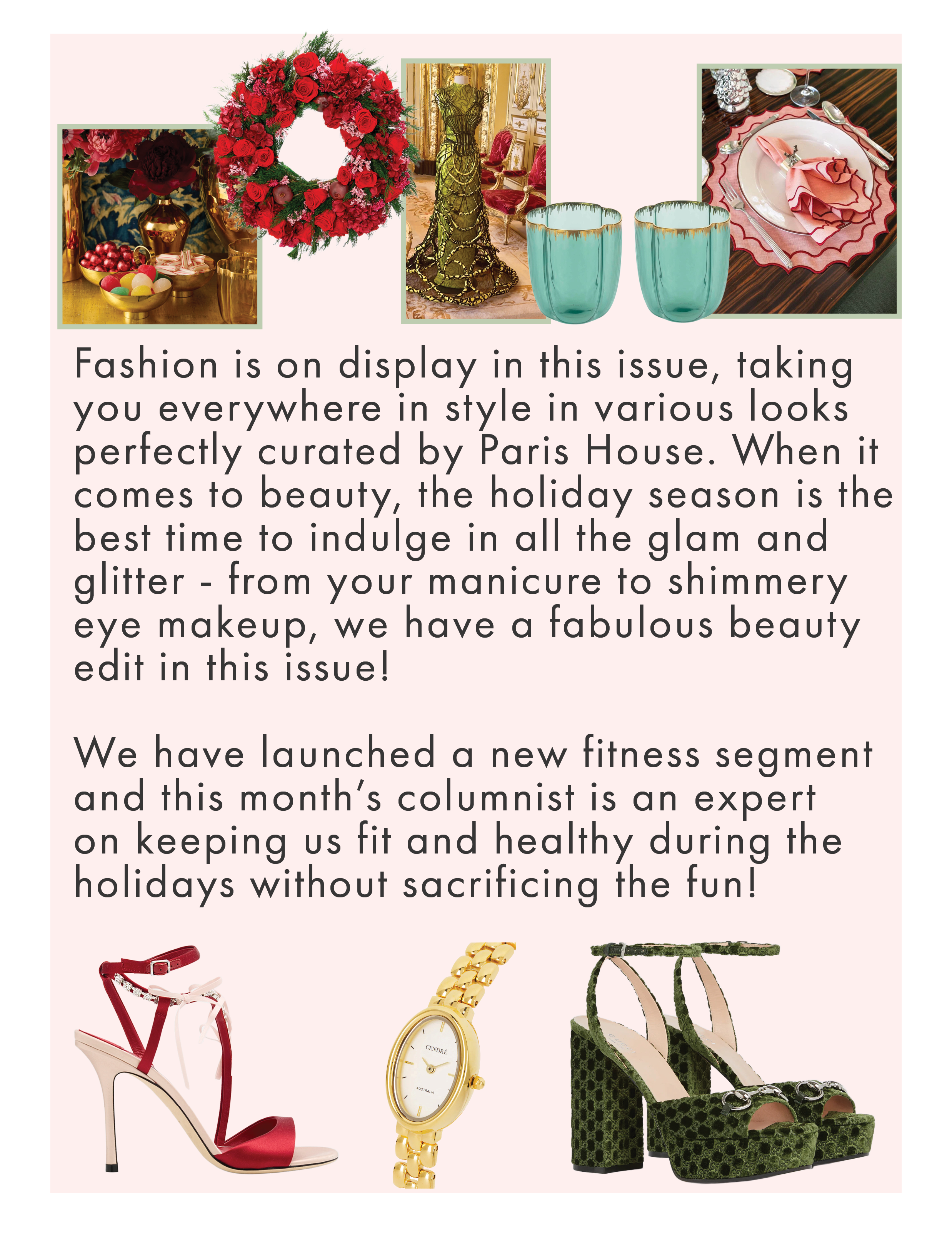 Fashion is on display in this issue, taking you everywhere in style in various looks perfectly curated by Paris House. When it comes to beauty, the holiday season is the best time to indulge in all the glam and glitter - from your manicure to shimmery eye makeup, we have a fabulous beauty edit in this issue!