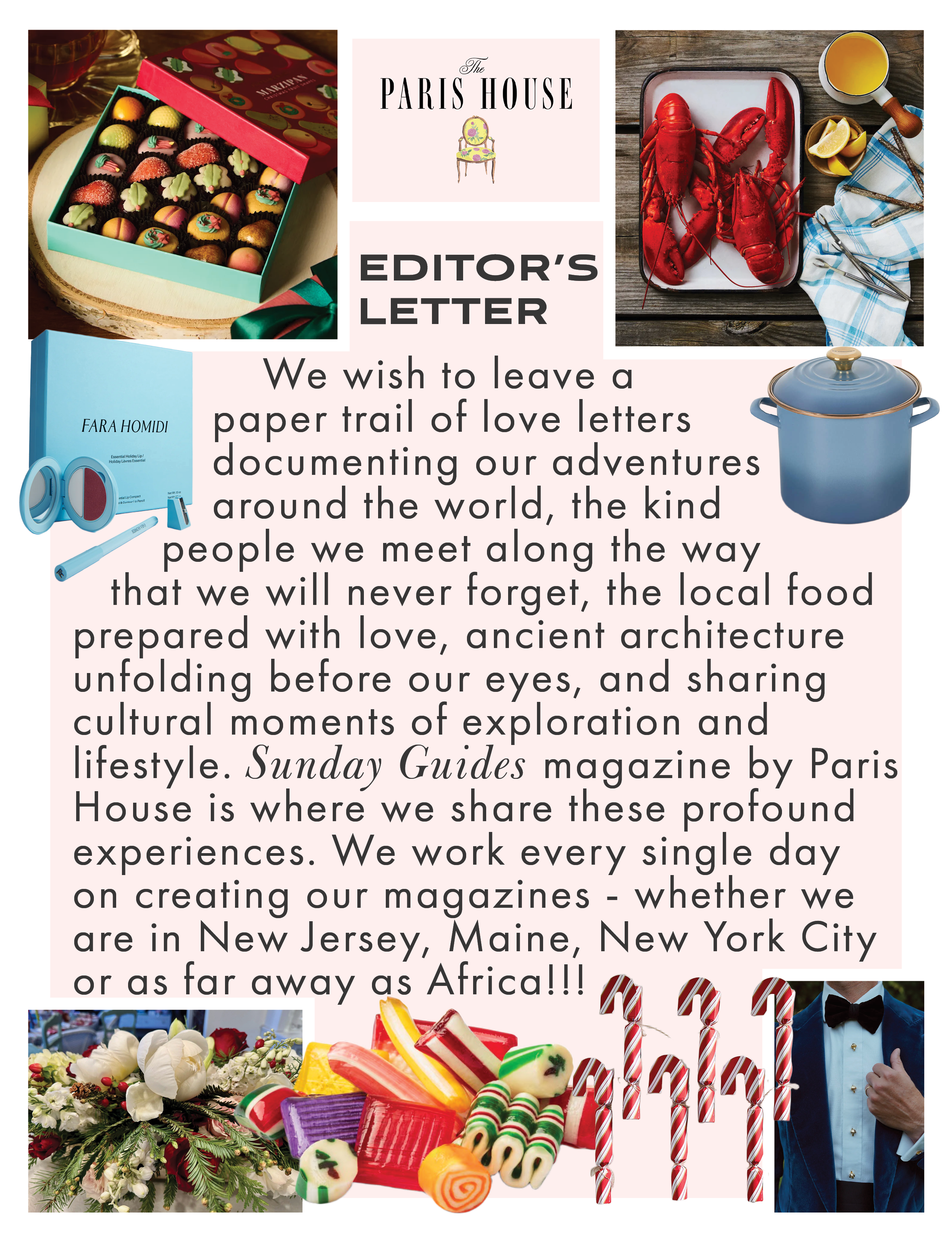 We wish to leave a paper trail of love letters documenting our adventures around the world, the kind people we meet along the way that we will never forget, the local food prepared with love, ancient architecture unfolding before our eyes, and sharing cultural moments of exploration and lifestyle. Sunday Guides magazine by Paris House is where we share these profound experiences. We work every single day on creating our magazines - whether we are in New Jersey, Maine, New York City or as far away as Africa!!!