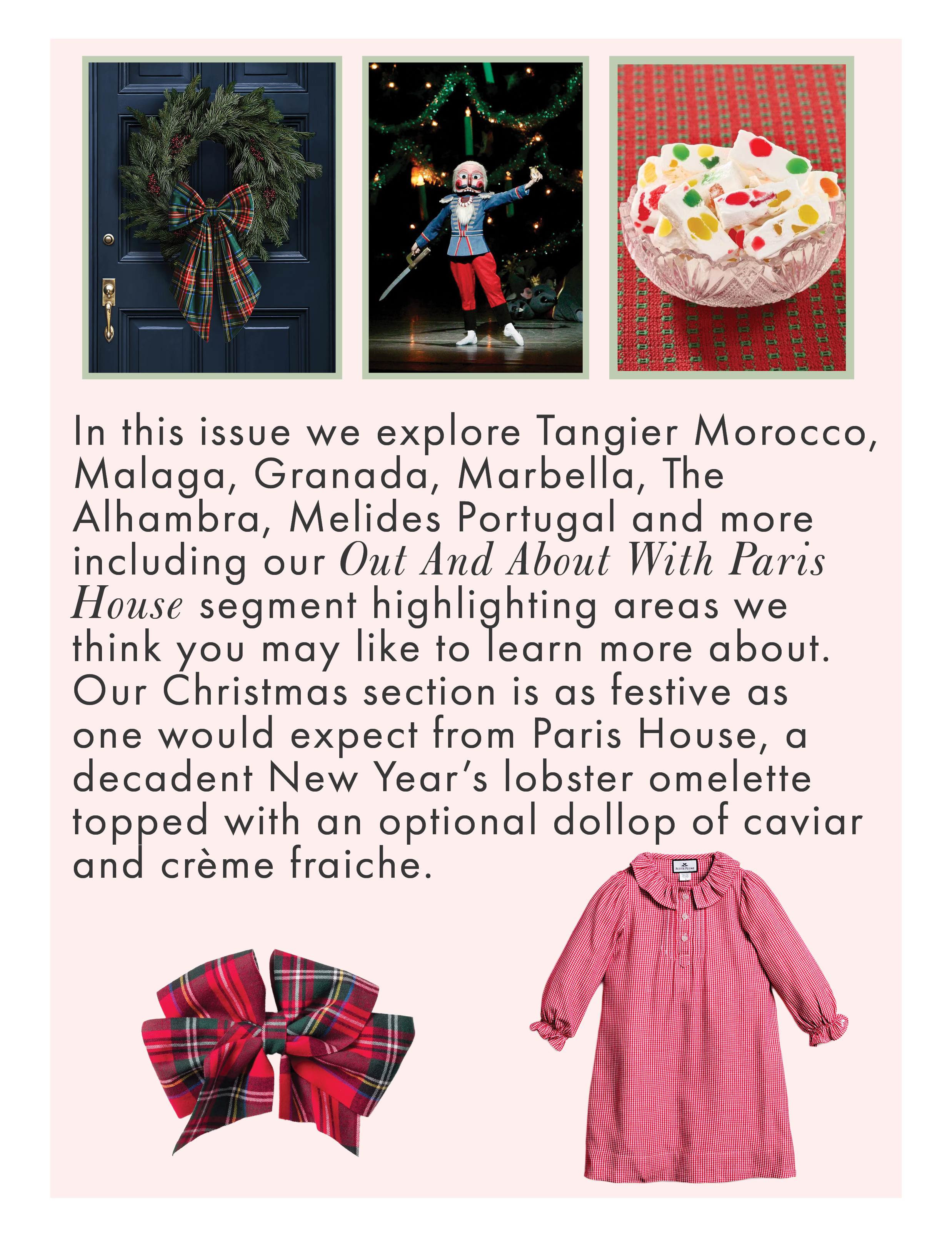 In this issue we explore Tangier Morocco, Malaga, Granada, Marbella, The Alhambra, Melides Portugal and more including our Out And About With Paris House segment highlighting areas we think you may like to learn more about. Our Christmas section is as festive as one would expect from Paris House, a decadent New Year’s lobster omelet topped with an optional dollop of caviar and crème fraiche.